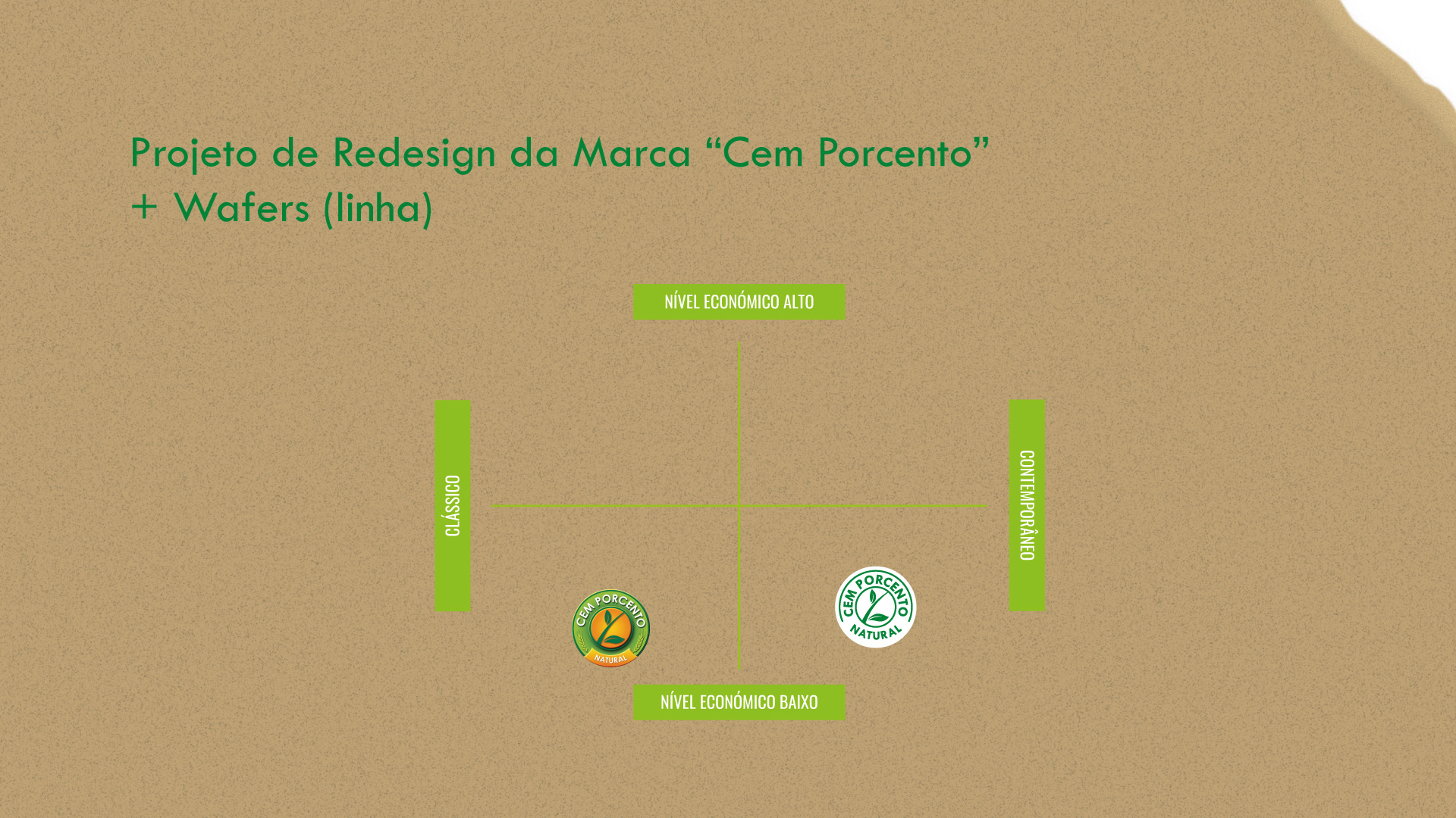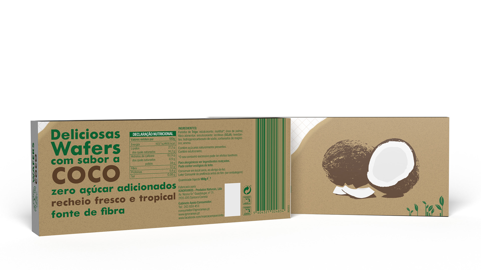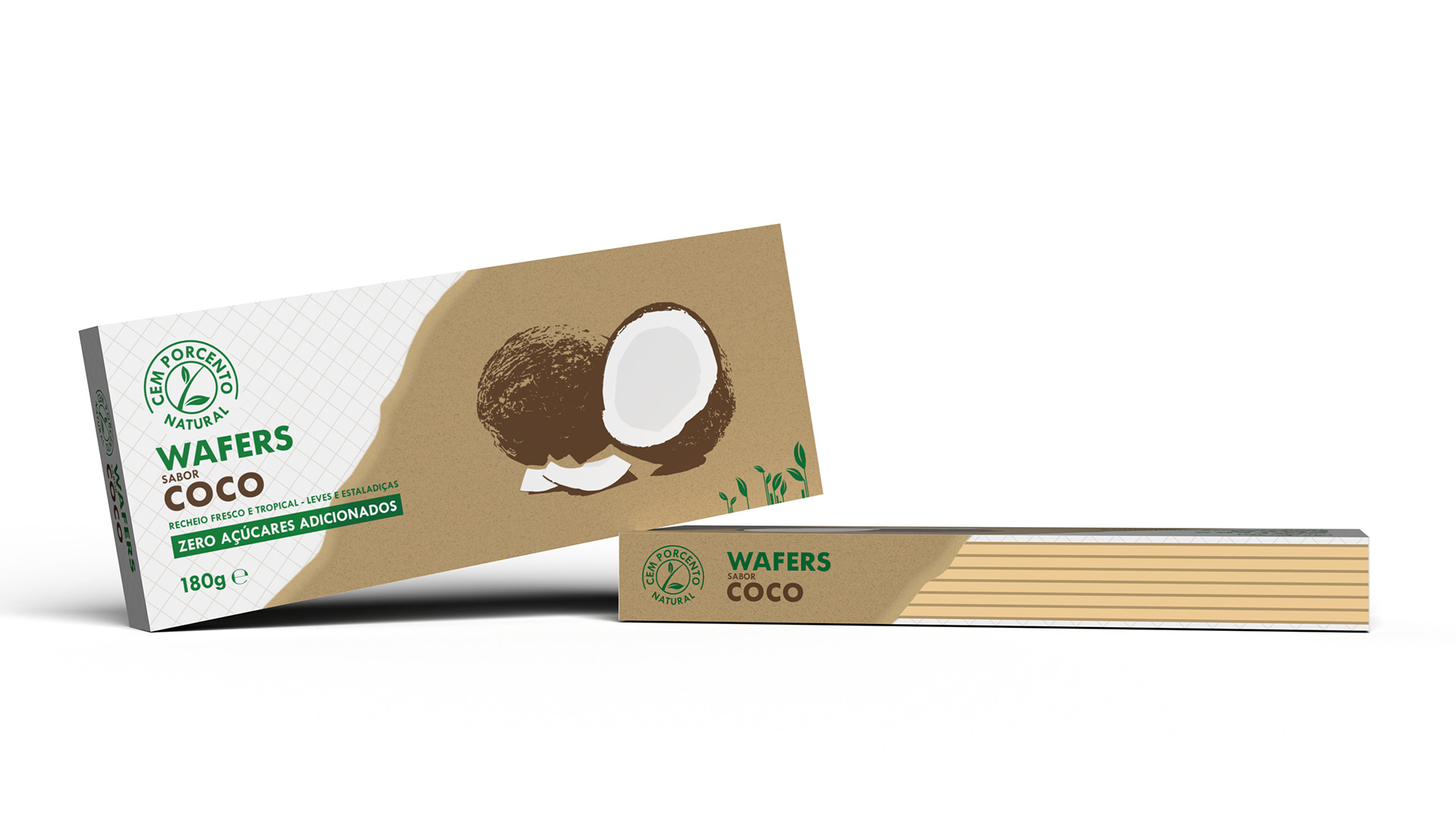 Redesign do packaging da marca Cem Porcento - Wafer de sabor a Coco, para um projeto universitário